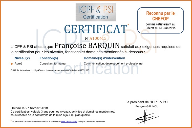 Françoise Barquin a été certifié par le Conseil national de l’emploi, de la formation et de l’orientation professionnelles comme consultant-formateur dans le domaine de la communication et le développement professionnel.